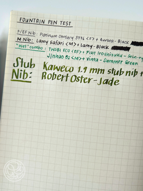 As for the sheening ink, the sheen was slightly dulled, but still visible with this highly saturated and high-sheen ink. That said, it may be slightly too absorbent to show sheen on inks that aren't extremely high-sheen.