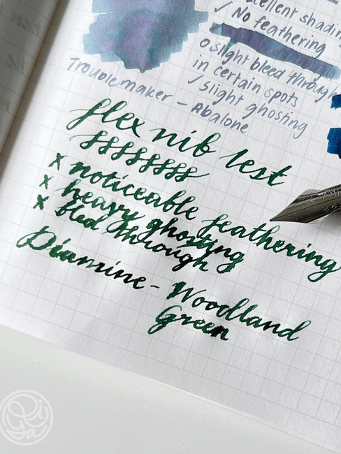 Flex nib pens can lay down a heavy, wet line of ink, especially during downstrokes. Even inks that seem only moderately wet in regular pens can gush with a flex nib. If the paper is too absorbent, the ink tends to spread uncontrollably and soak through.