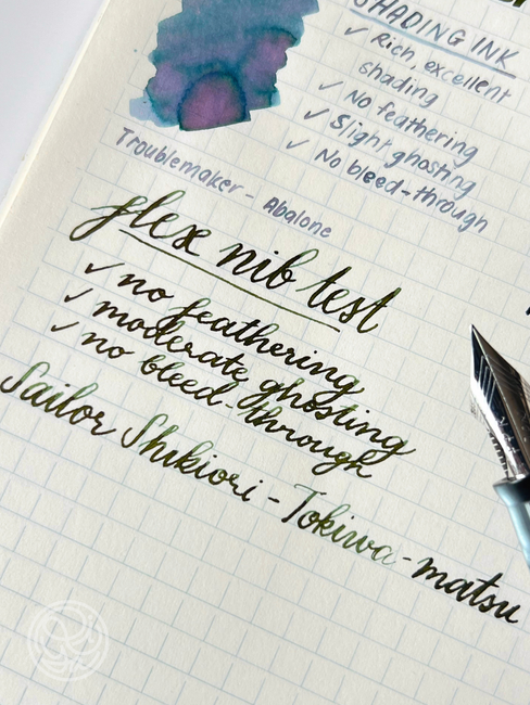 Flex nib pens can lay down a heavy, wet line of ink, especially during downstrokes. Even inks that seem only moderately wet in regular pens can gush with a flex nib. If the paper is too absorbent, the ink tends to spread uncontrollably and soak through.